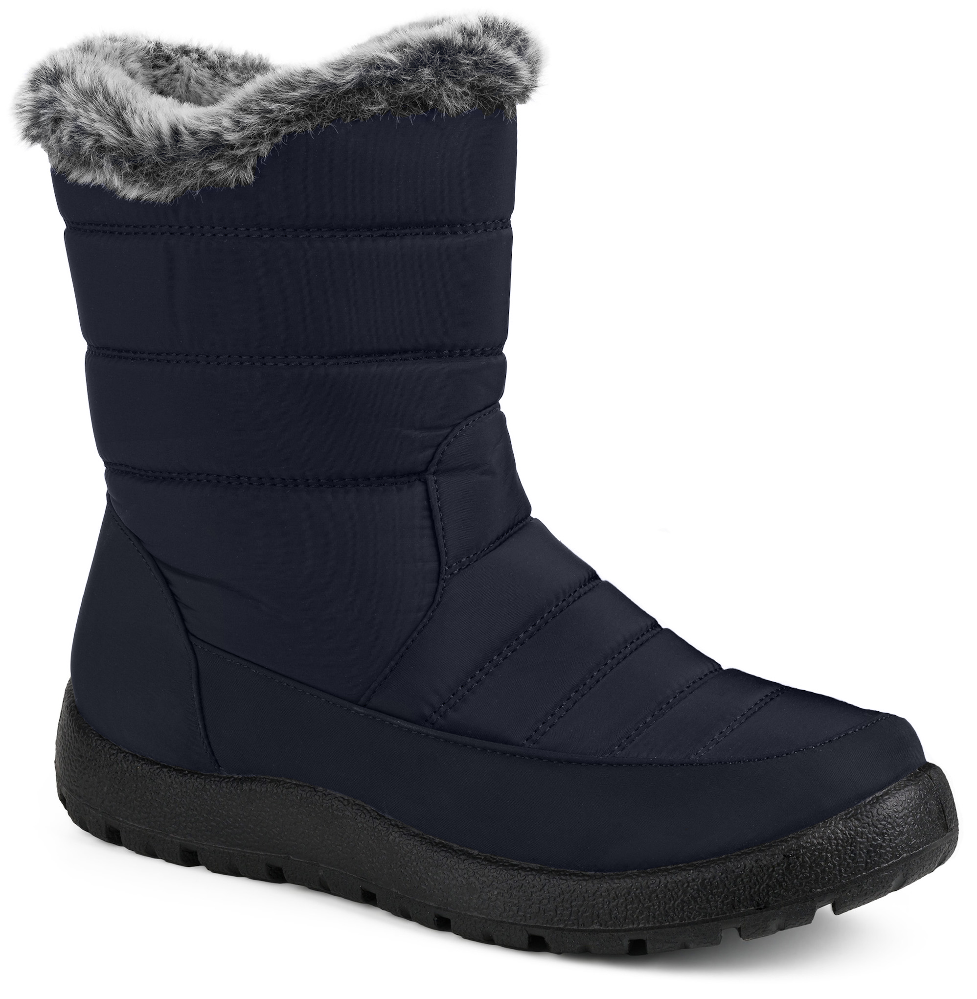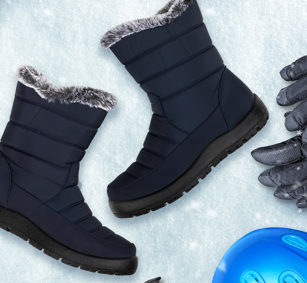 Damskie śniegowce w kolorze granatowym, posiadają solidne ocieplenie, elastyczne grube podeszwy zapewniające wygodę i izolację od zimna.