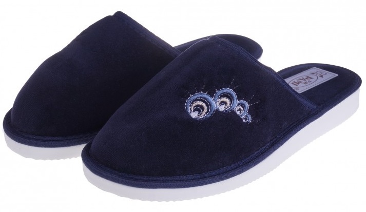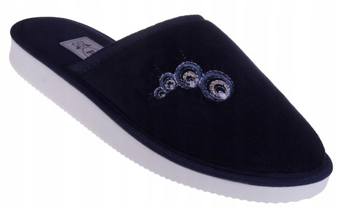 Kapcie w kolorze granatowym. Palce zakryte. Podeszwa z lekkiej pianki. Przewiewny materiał z którego zostały wykonane idealnie sprawdzi się w codziennym użytkowaniu. Modne wzornictwo.