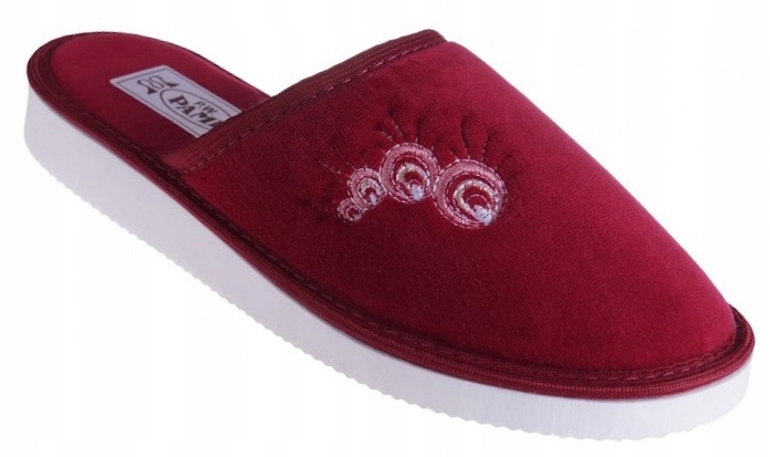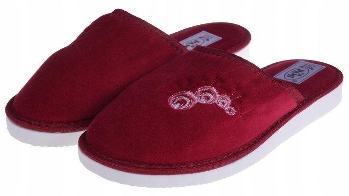 Kapcie w kolorze bordowym. Palce zakryte. Podeszwa z lekkiej pianki. Przewiewny materiał z którego zostały wykonane idealnie sprawdzi się w codziennym użytkowaniu. Modne wzornictwo.