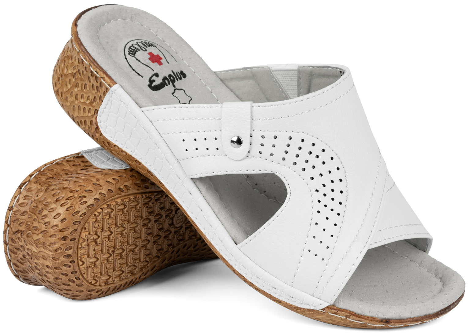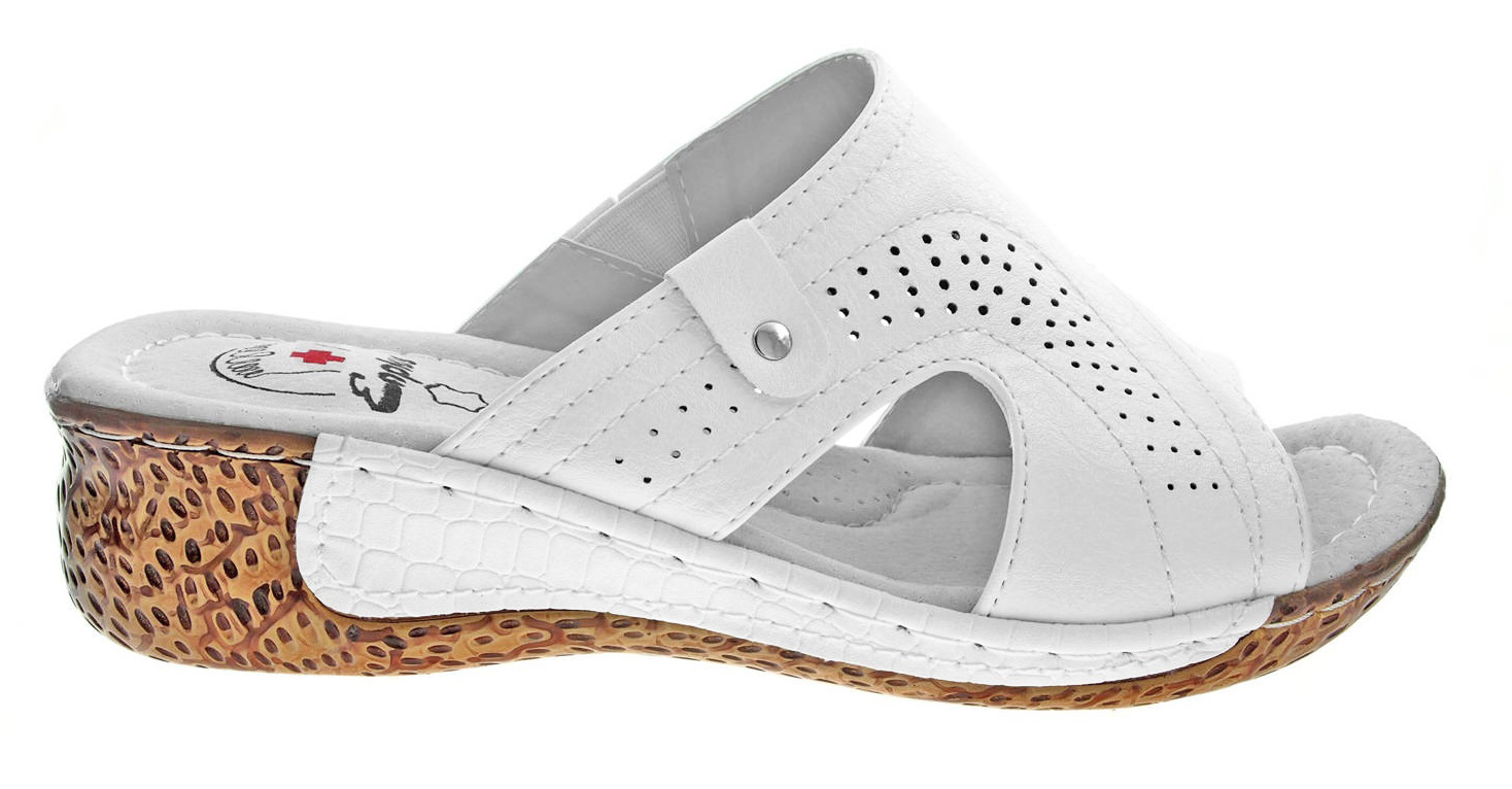 Damskie klapki medyczne na koturnie, wykonane z najwyższej jakości materiałów. Cholewkę wykonano z eko-skóry z gumką która reguluje tęgość obuwia. Wewnątrz na wkładce zastosowano skórę naturalną.