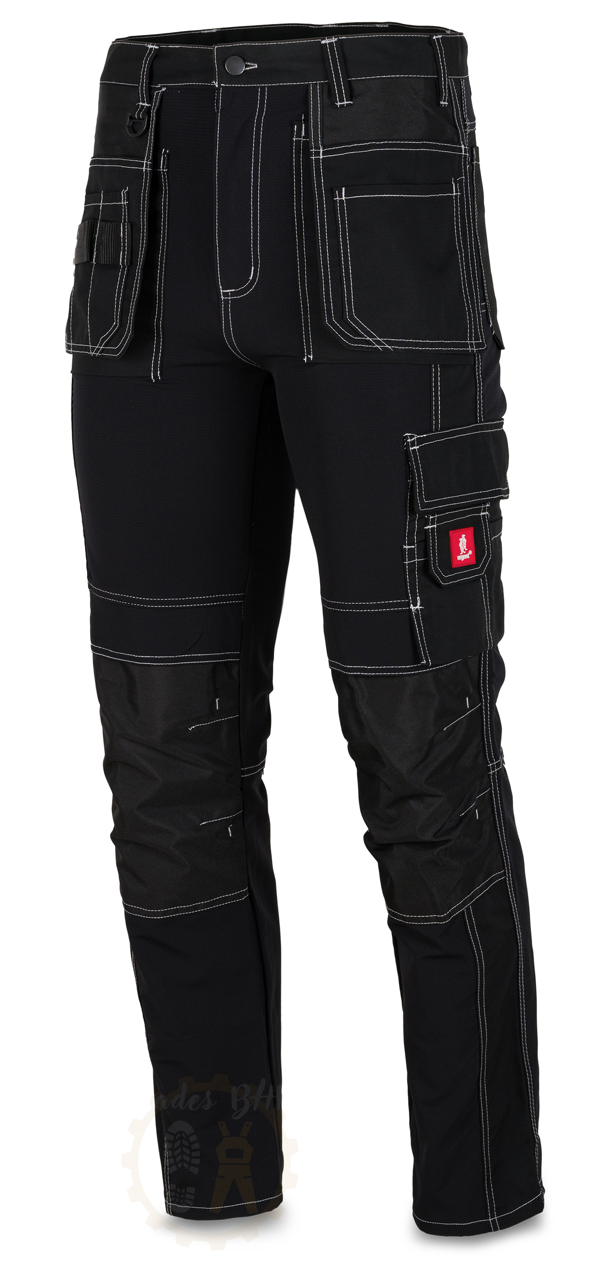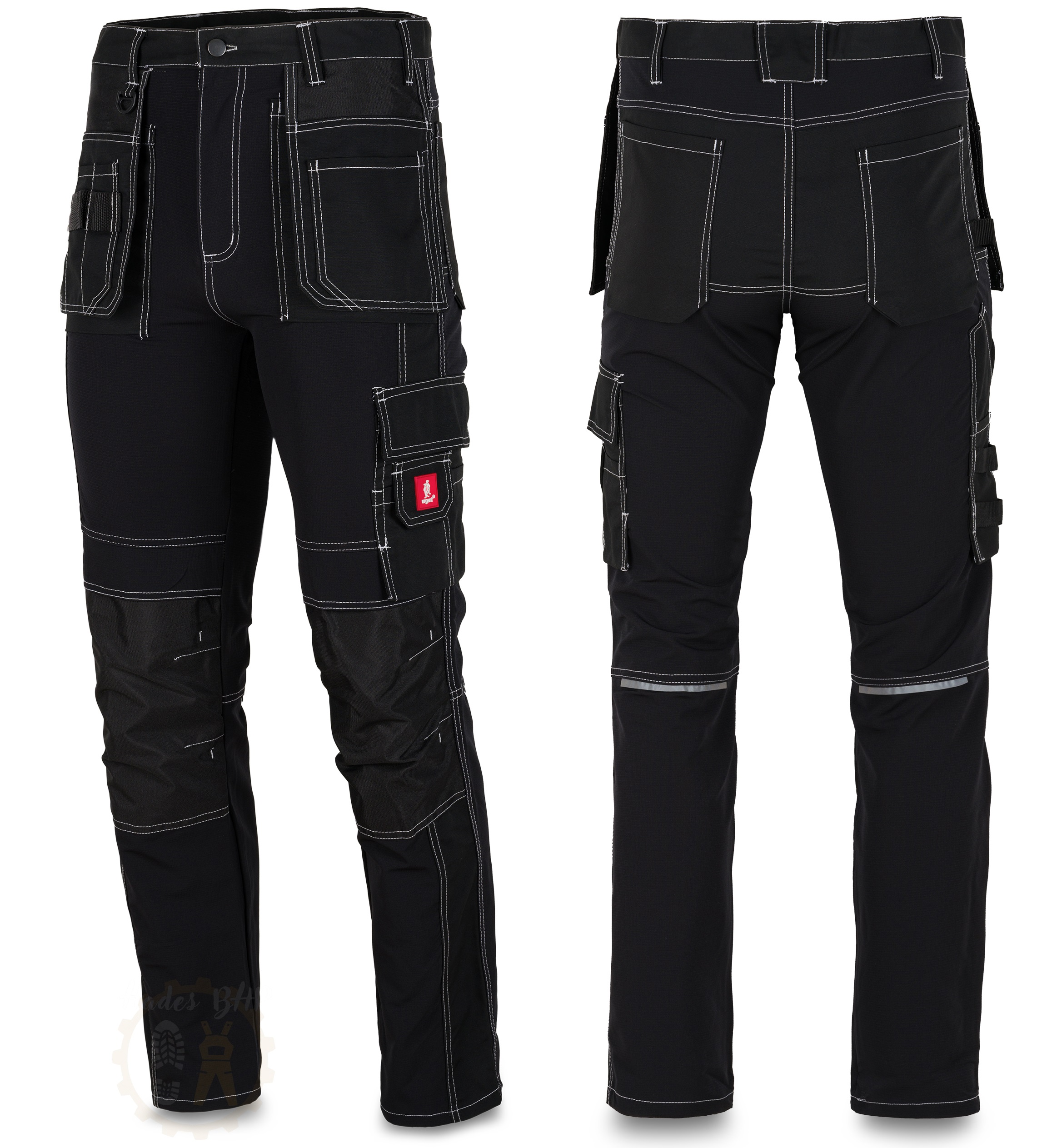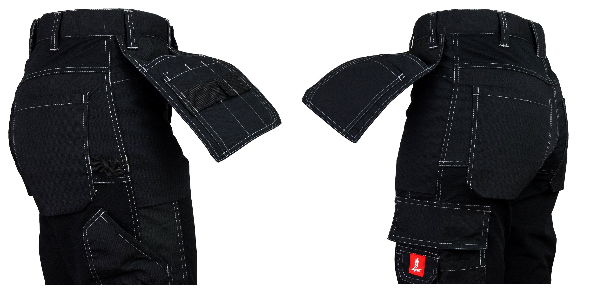 Dzięki elastycznym wstążkom i regulacji, spodnie są wygodne i dobrze trzymają się na miejscu, niezależnie od intensywności ruchów. Slimowane nogawki oraz elastyczny materiał niezwykle dobrze współpracują z pracą w ruchu. Wyposażone są w praktyczne kieszenie monterskie, które umożliwiają przechowywanie narzędzi, telefonu komórkowego i innych niezbędnych przedmiotów w zasięgu ręki. To zwiększa efektywność pracy i ułatwia organizację narzędzi.
